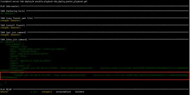 2.创建playbook文件 deploy_nodes_playbook.yml,针对除master外的其它集群节点,安装kubeadm,kubelet,并将节点加入到k8s集群中,使用的是前面部署master时输出的加入集群命令