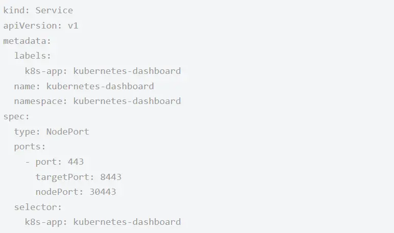 将Service type改为NodePort,使得可通过IP访问Dashboard。注释掉默认的Secret(默认的secret权限很有限,看不到多少数据)