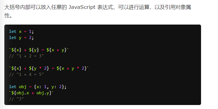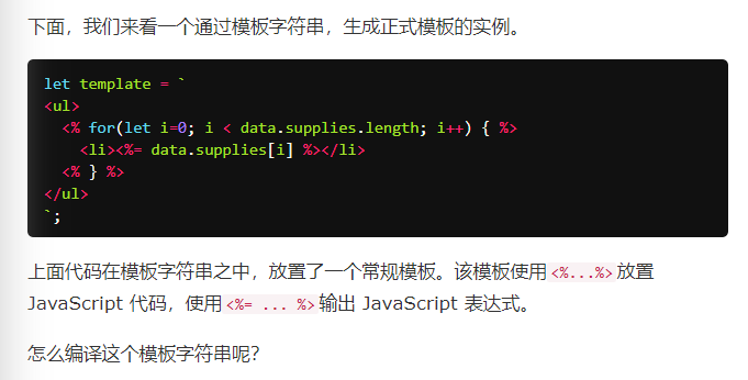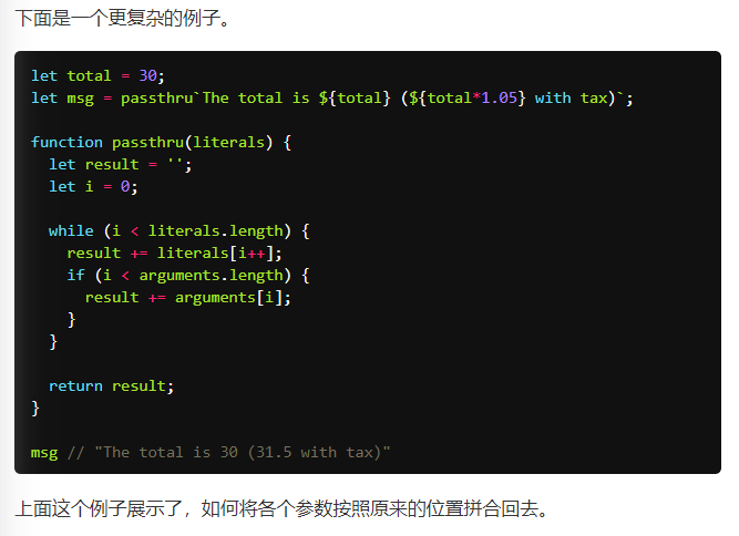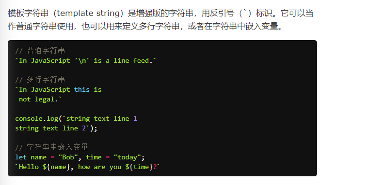 es 6 3、字符串的拓展(私人仓库) MrLiAng105105 2020-06-06 78 阅读1分钟 一、 1、 2、 3、 4、 5、 =》函数的大括号放在了反引号里面,不然会出错。 六、实例:模板编译 1、 七、标签模板 1、 2、 3、 可以看出 当只存在一个参数时,传入的就是非变量。 当传入所有参数后, 可以通过arguments拿到所有的参数。 具体见下面的5中。 4、 当采用rest写法时, 5、 标签模板的一个重要应用就是:过滤HTML字符串,防止用户输入恶意内容 6、标签模板的另一个应用就是:多语言转换(国际化处理) 7、 八、模板字符串的限制