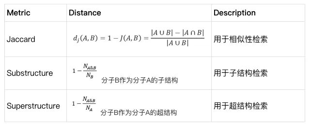 Milvus 支持各种常用的相似度计算指标,包括欧氏距离、内积、汉明距离和杰卡德距离等。针对二值型数据 MolSearch 系统选择 Jaccard/Substructure/Superstructure 距离计算相似度。