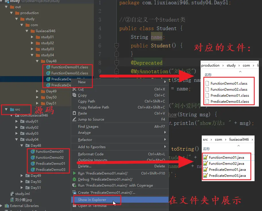 那么在对应的文件夹下就会有一个Student.java文件,也就是源码;同时开发工具会给我编译一个对应的Student.class文件,也就是字节码文件;