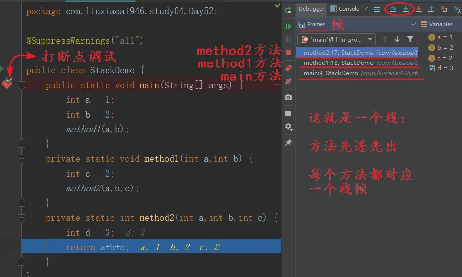 利用开发工具IDEA断点调试,我们可以很清晰地看到方法进栈出栈的过程。