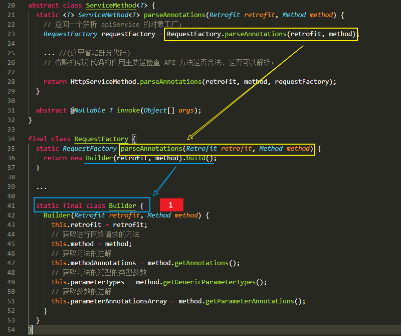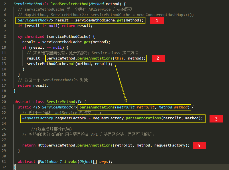 我们回到上图 标注4 处,这里继续对 API 方法进行解析。我们都知道,对注解进行解析,往往会使用到反射,正如该方法的官方注释写道: This requires potentially-expensive reflection so it is best to build each service method only once and reuse it. 这同时也验证了上文读取缓存的必要性。
