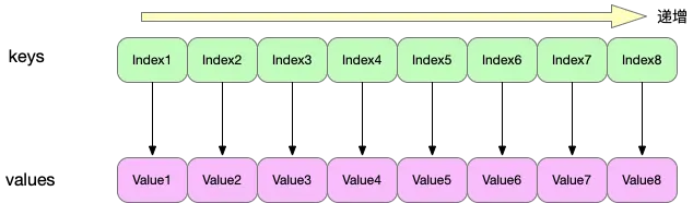 - 用数组实现,key递增插入数组,通过二分查找实现遍历,不同于HashMap的数组+链表/红黑树,因此时间复杂度低于HashMap