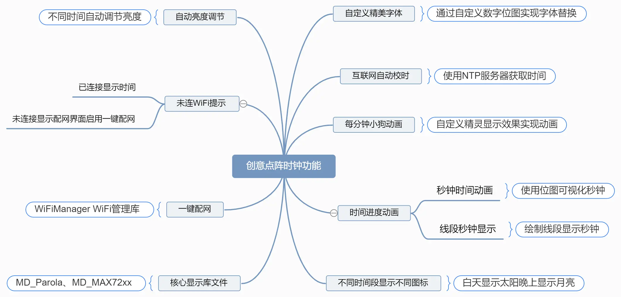 为了达到我们的预期目标,我们先绘制功能的思维导图,再根据思维导图逐步实现创意点阵时钟的程序设计。