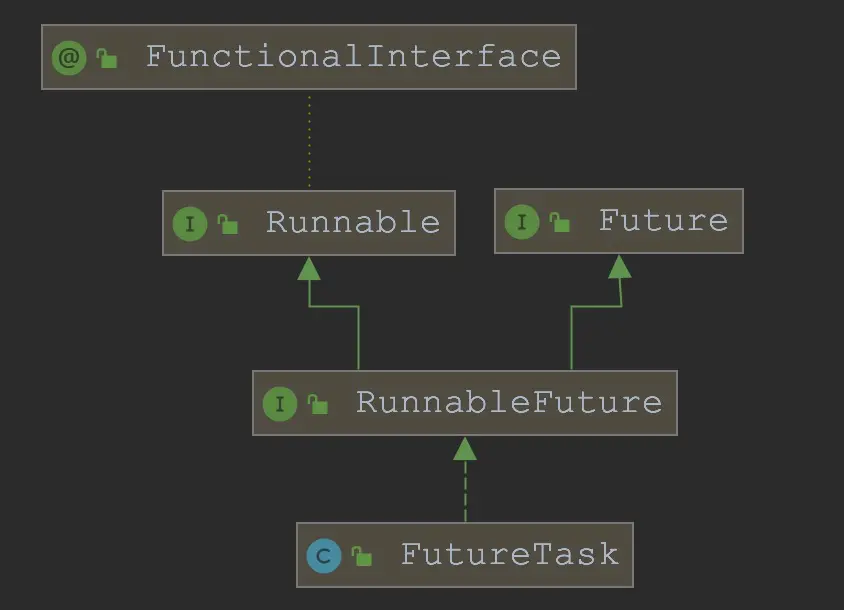- FutureTask并不是直接实现Future接口的,而是通过RunnableFuture接口来间接实现- - RunnableFuture接口很简单,就是继承了Runnable和Future接口
