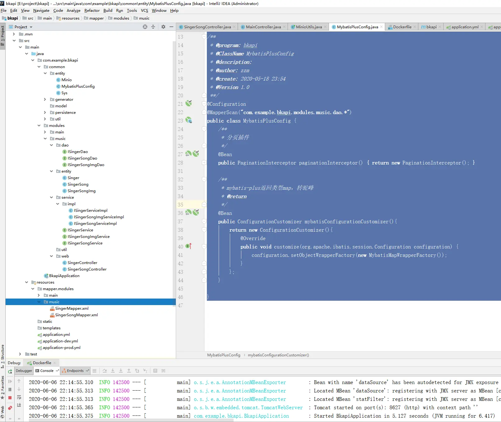 @RequestMapping(value = "{sys.getAdminPath()}/music/singerSonger") @MapperScan("com.example.bkapi.modules.music.dao") @Controller public class SingerSongController { @Resource private ISingerSongService singerSongService; @ResponseBody @CrossOrigin @RequestMapping(value = "list") public Object list(@ModelAttribute("SingerSong") SingerSong singerSong, Page page){ Map<String, List> data = new HashMap<>(); IPage iPage = singerSongService.pageList(page, singerSong); List records = iPage.getRecords(); } }- service层,要写两个文件,一个接口,一个实现类