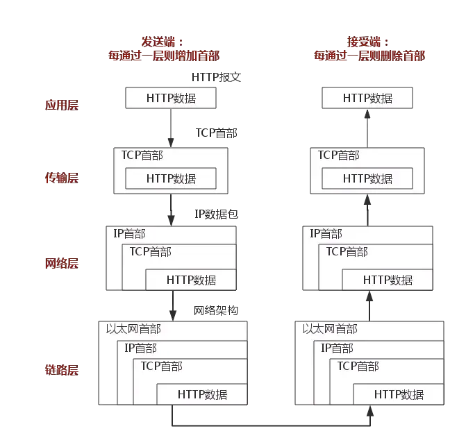 利用TCP/IP协议族进行网络通信时,发送端从应用层往下走,层层包装,接收端则是相反的往上走到应用层,层层解包。