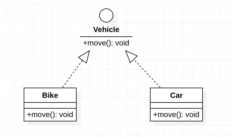 比如表示一个交通工具的接口,其中有一个 move 方法,有两个类 Bike 和 Car 分别实现了 Vehicle,那么也就实现了 move() 方法
