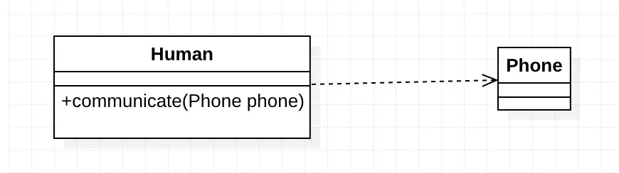 在 UML 类图中,依赖关系使用带箭头的虚线来表示,箭头从使用类指向被依赖的类,例如下面这个例子