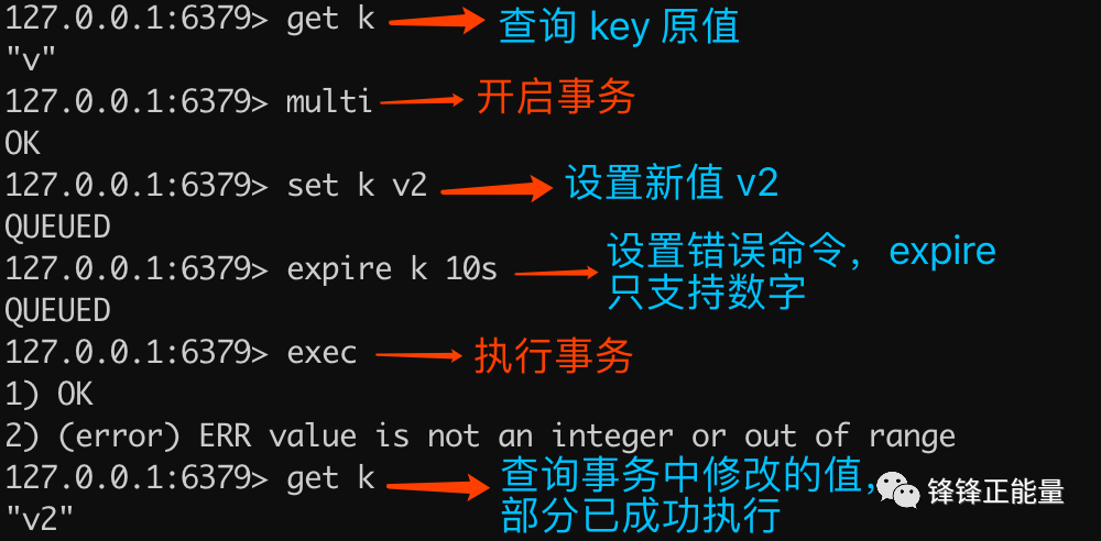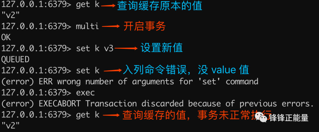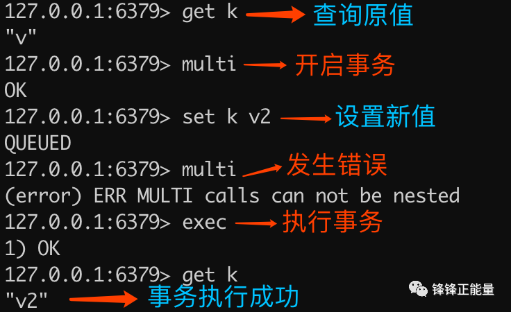 从以下实例结果可以看出,重复执行 multi 会导致入列错误,但不会终止事务,最终查询的结果是事务执行成功了。除了重复执行 multi 命令,还有在事务状态下执行 watch 也是同样的效果