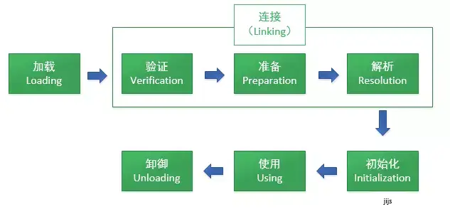 从类被加载到虚拟机内存中开始,到卸御出内存为止,它的整个生命周期分为7个阶段,加载(Loading)、验证(Verification)、准备(Preparation)、解析(Resolution)、初始化(Initialization)、使用(Using)、卸御(Unloading)。其中验证、准备、解析三个部分统称为连接。