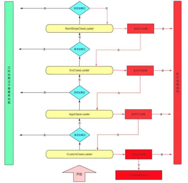 当一个类收到了类加载请求,他首先不会尝试自己去加载这个类,而是把这个请求委派给父类去完成,每一个层次类加载器都是如此,因此所有的加载请求都应该传送到启动类加载其中,只有当父类加载器反馈自己无法完成这个请求的时候(在它的加载路径下没有找到所需加载的Class),子类加载器才会尝试自己去加载。