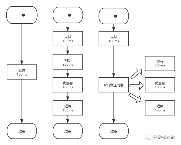1.异步 :一个下单流程,你需要扣积分,扣优惠卷,发短信等,有些耗时又不需要立即处理的事,可以丢到队列里异步处理。