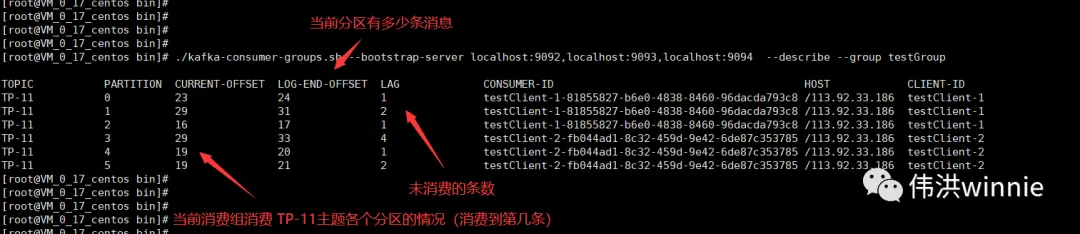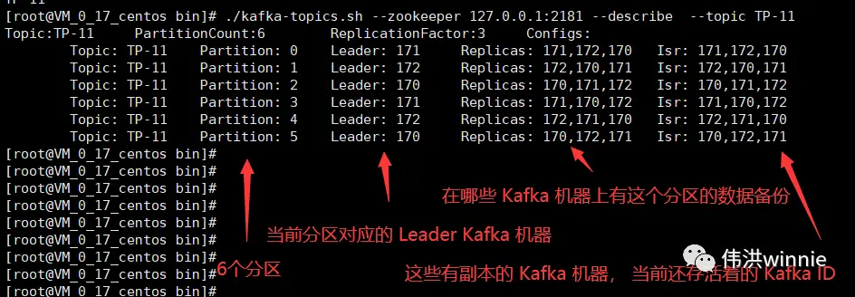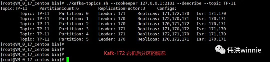 Replicas 表示在哪些 Kafka 机器上有主题的副本,Isr 表示当前有副本的 Kafka 机器上还存活着的 Kafka 机器。主题分区中所涉及的 Leader Kafka 宕机时,会将宕机 Kafka 涉及的分区分配到其它可用的 Kafka 节点上。如下: