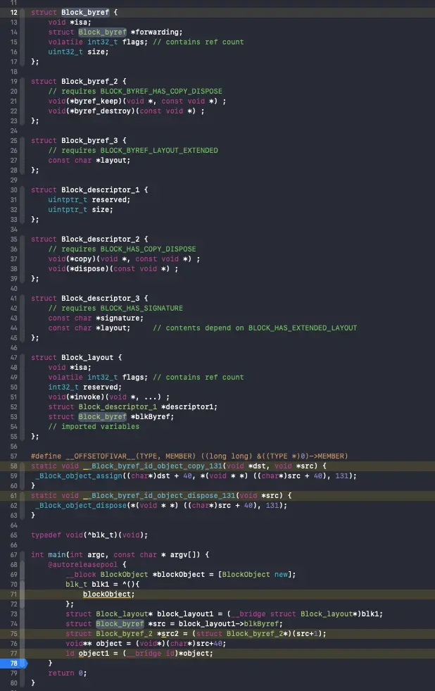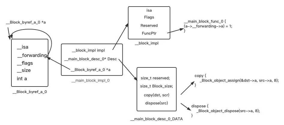 很显然,__main_block_func_0函数中存放的是我们定义的myBlock大括号里面的代码,该函数直接赋值给__main_block_impl_0构造函数的第一个参数fp指针,而fp又赋值给__block_impl结构体中的FuncPtr变量。