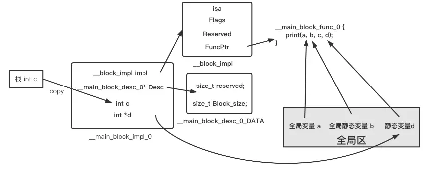 我们先来看__main_block_impl_0结构体,和之前一样,局部变量c是以值拷贝的形式传到了结构体中,而静态变量d并不是值拷贝的形式被捕获,__main_block_impl_0结构体中保存了&d,即一个指向静态变量d的指针。