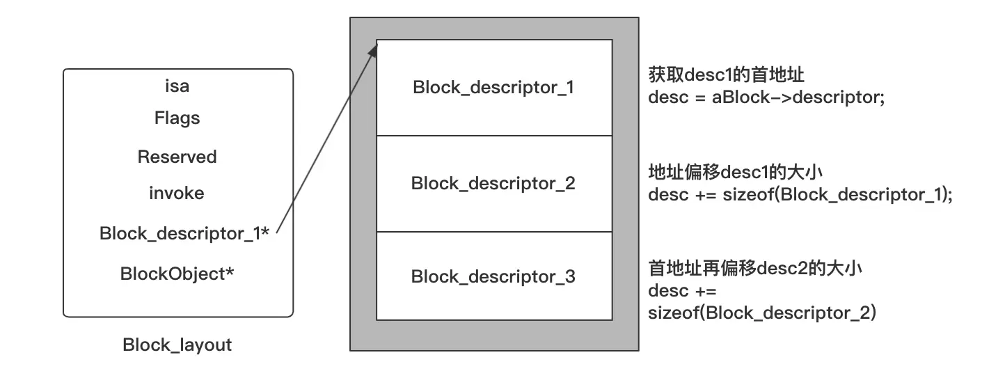 ((void (*)(__block_impl *, int, int))为函数的类型((__block_impl *)myBlock)->FuncPtr),在上面我们已经知道myBlock其实对应的是__main_block_impl_0的结构体,但是这里进行了类型转换,转换成了__block_impl的结构体,进而拿到了对应的FuncPtr。这样做的原因是因为__main_block_impl_0中__block_impl位于结构体的第一位,因此他们的指针地址都指向了同一片内存空间,可以进行强制转换,至于为什么这样做而不是先获取__block_impl再获取FuncPtr,可能是因为直接进行类型转换在性能上会优越一点,毕竟少了一步获取__block_impl的过程。- 获取到