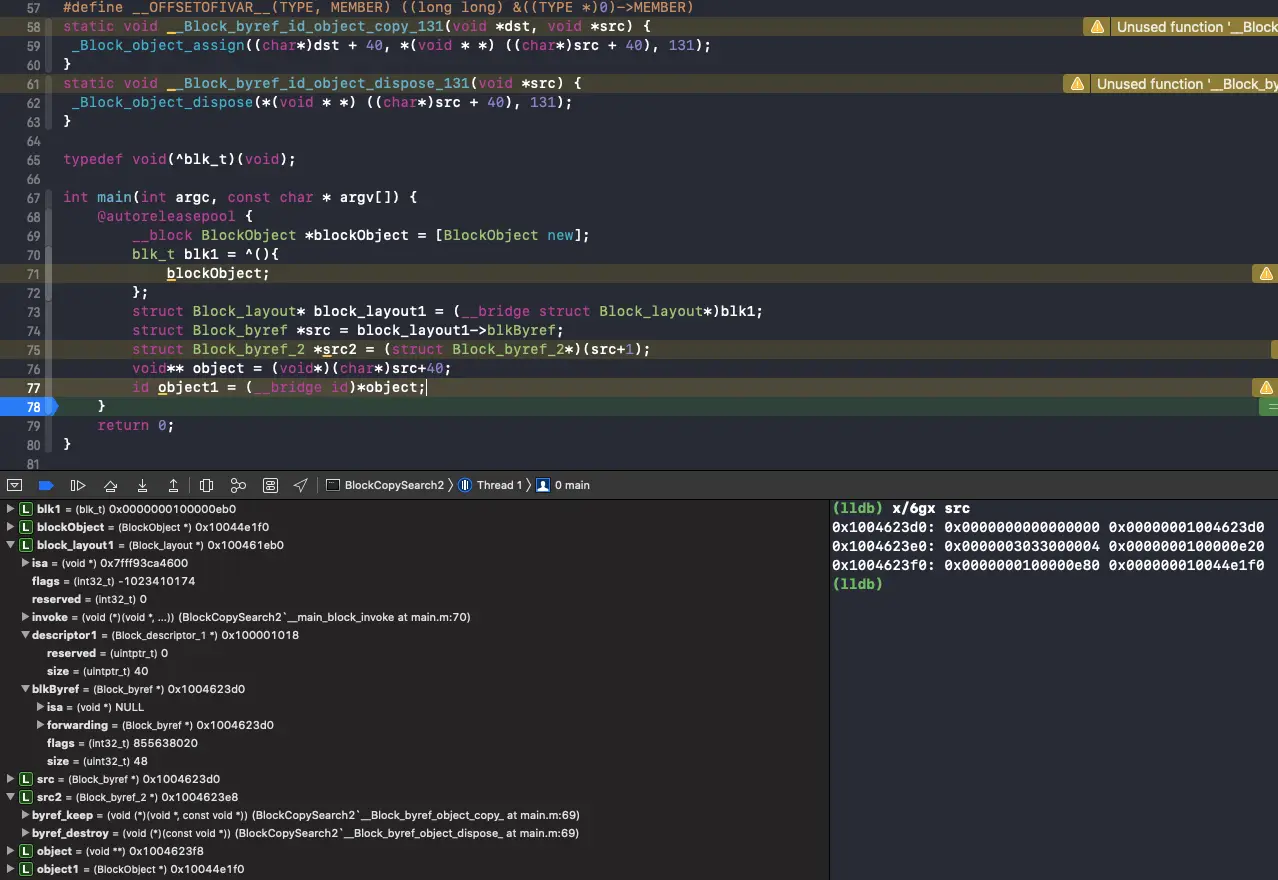 //keep/destroy函数的最终实现也是_Block_object_assign/_Block_object_dispose,只不过传递的参数为Block_byref结构体,需要通过地址偏移来拿到对应的对象。如下:
