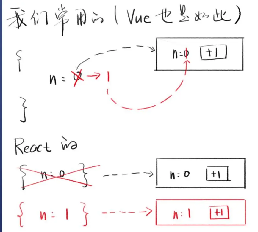 当我们想改变这个state里的数据时,React希望我们不要改变原来的那个state。而是生成一个新的对象,覆盖原来的。至于原来的对象不用管。然后这个新的state又对应一个新的虚拟DOM。