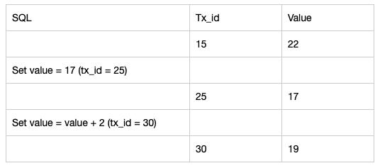 经过两次事务的操作,value从22变成了19,同时,保留了三个事务id,15、25、30。