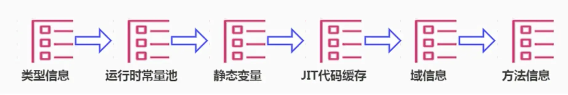 对每个加载的类型( 类class、接口interface、枚举enum、注解annotation),JVM必 .须在方法区中存储以下类型信息: