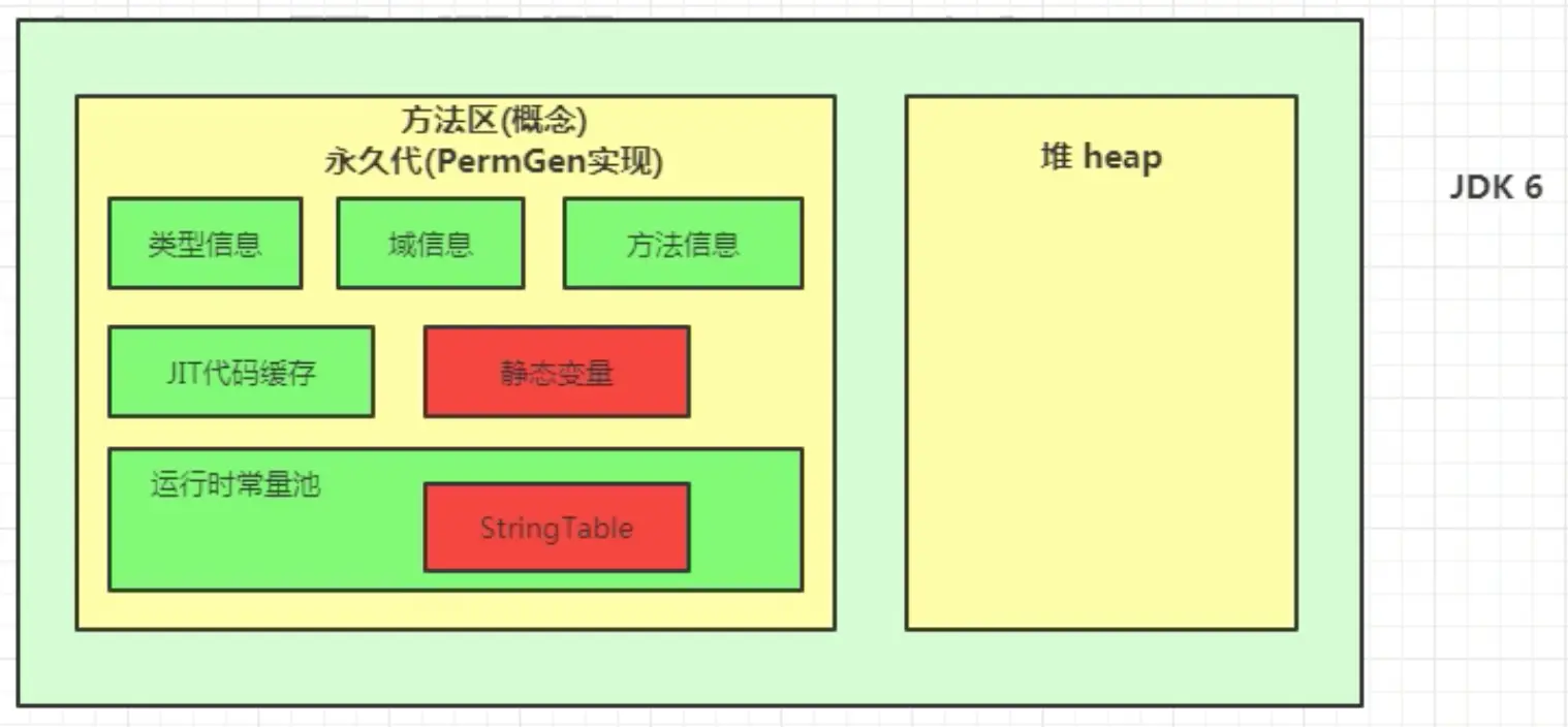 - jdk1.6及之前:有永久代(permanent generation) ,静态变量存放在 永久代上