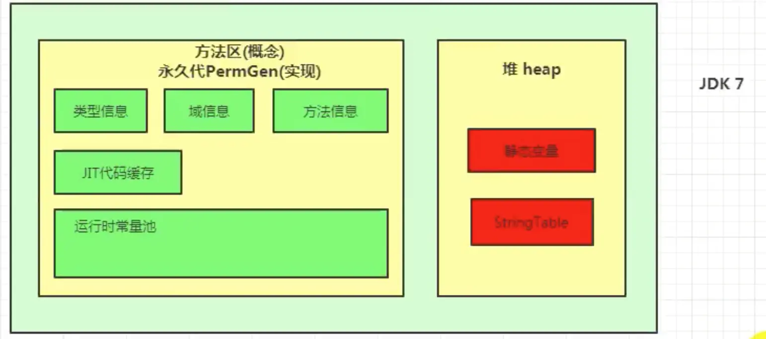- jdk1.7:有永久代,但已经逐步“去永久代”,字符串常量池、静态变量移除,保存在堆中
