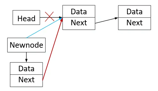 5)newnode = this.head:由于this.head存了第一个节点的地址,即指向第一个节点,现把该地址赋值给newnode,相当于指newnode也指向了该节点(见下图蓝箭头);