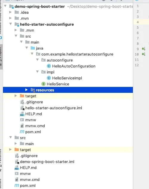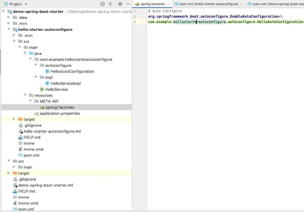 包含HelloService和实现类,HelloAutoConfiguration配置类,具体如下