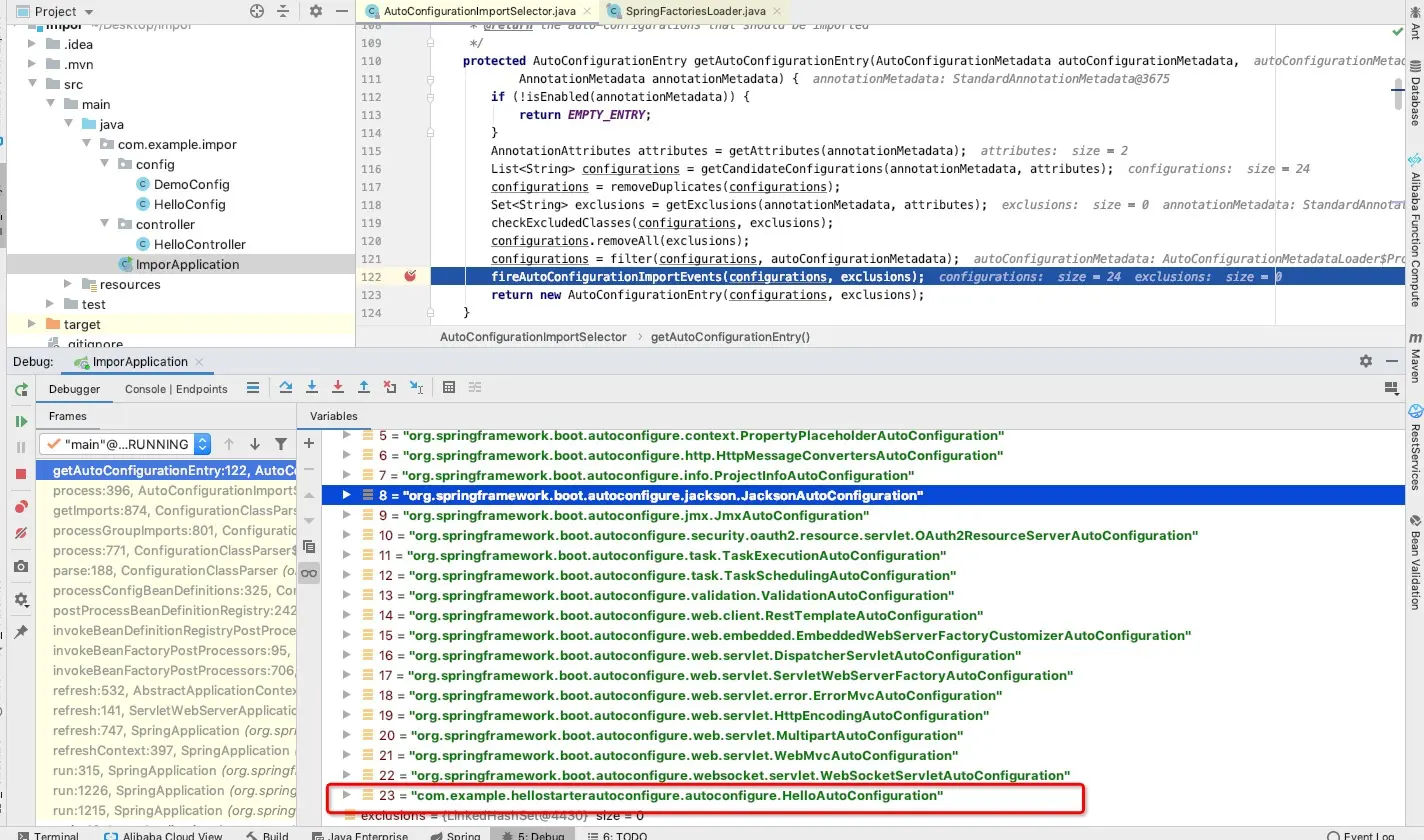 String[]返回的字符串会全部被注入到bean容器中,我们看getAutoConfigurationEntry这里面的实现。在这个实现中对获取到了的类进行了去重加过滤等,最后过滤出来的configurations截图如下,有我们在前面设置的com.example.hellostarterautoconfigure.autoconfigure.HelloAutoConfiguration,