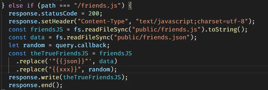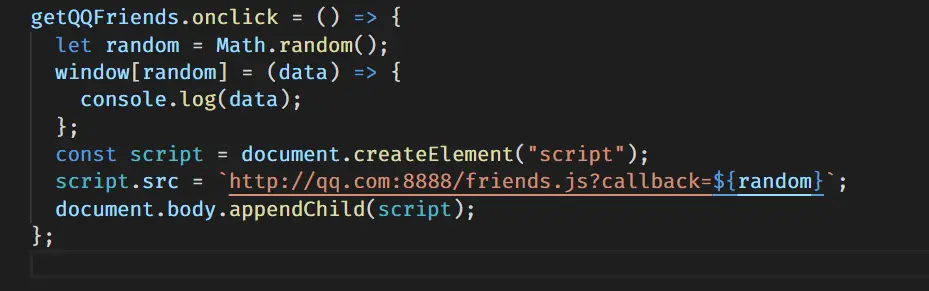 为了保证fn的名字不会与其他函数的名称冲突,我们可以通过 Math.random() 来随机生成一个函数名,通过设置查询参数 callback 传给后台,后台通过 query.callbak 就能那个获取到随机的函数名,对js文件中的函数名进行设置了。