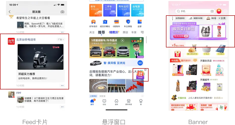 而目前需求绝大多数的落地页投放一般会按常规的固定Banner位置进行投放,但是也有Feed卡片以及悬浮窗口。