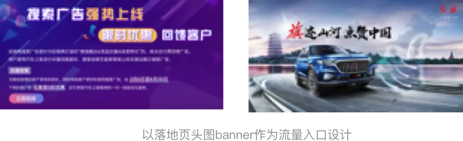 目前落地页的各类需求大多都是以Banner形式引导用户点击,而常见的悬浮窗口的入口设计,如818超级车展、VR车展等在APP首页的推荐,都采用的悬浮样式,是打破常规的Banner设计样式结构,以异形结构来吸引用户以达到入口设计增加流量。而Banner可发挥的空间比较大,且与落地页有传承性(一般点击跳转后的落地页头图都是用宣传banner),且使用过程中推广能让用户更容易在清楚产品核心诉求。