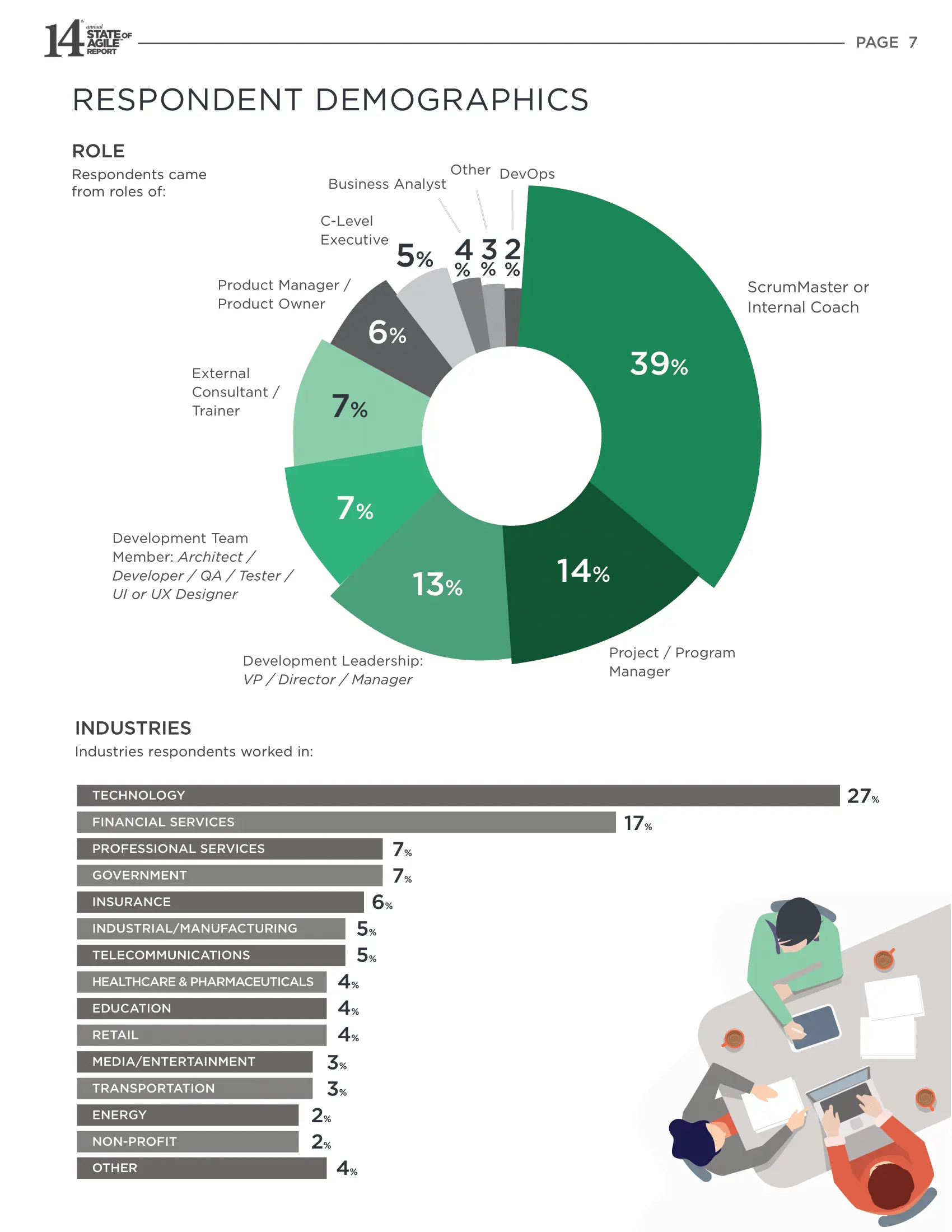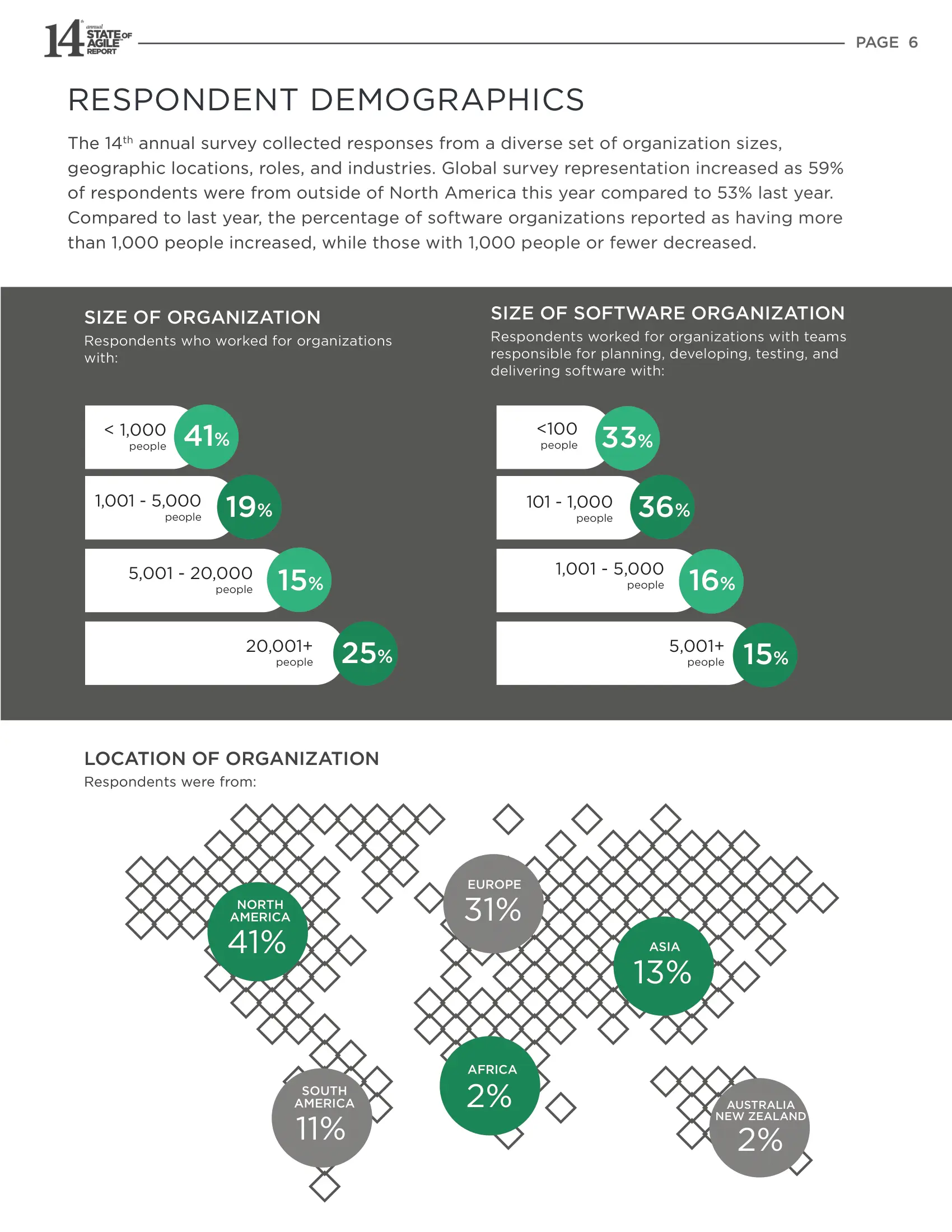 上述两页是调查者统计分布。 第14届年度调查收集了来自不同组织规模,地理位置,角色和行业的反馈。今年,全球调查的代表人数增加了59%,而去年这一数字为53%。 与去年相比,报告有1000余人的软件组织百分比有所增加,而有1000人以下的软件组织的百分比有所下降。
