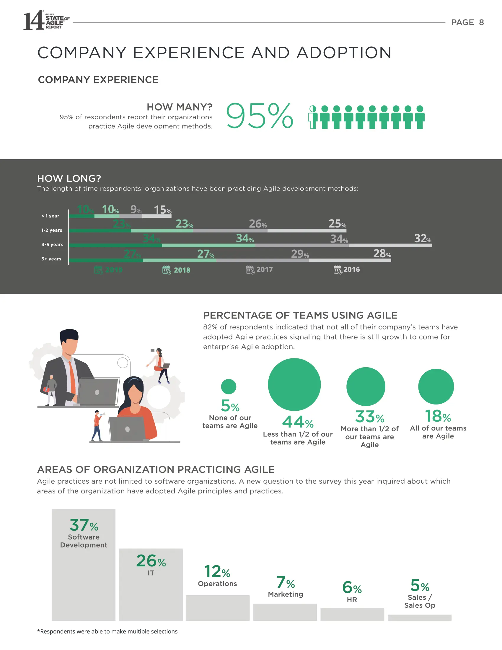 82%的调查者表示,他们公司内并不是所有的团队都采用敏捷实践, 这代表了企业级的敏捷转型仍有较大的增长空间。