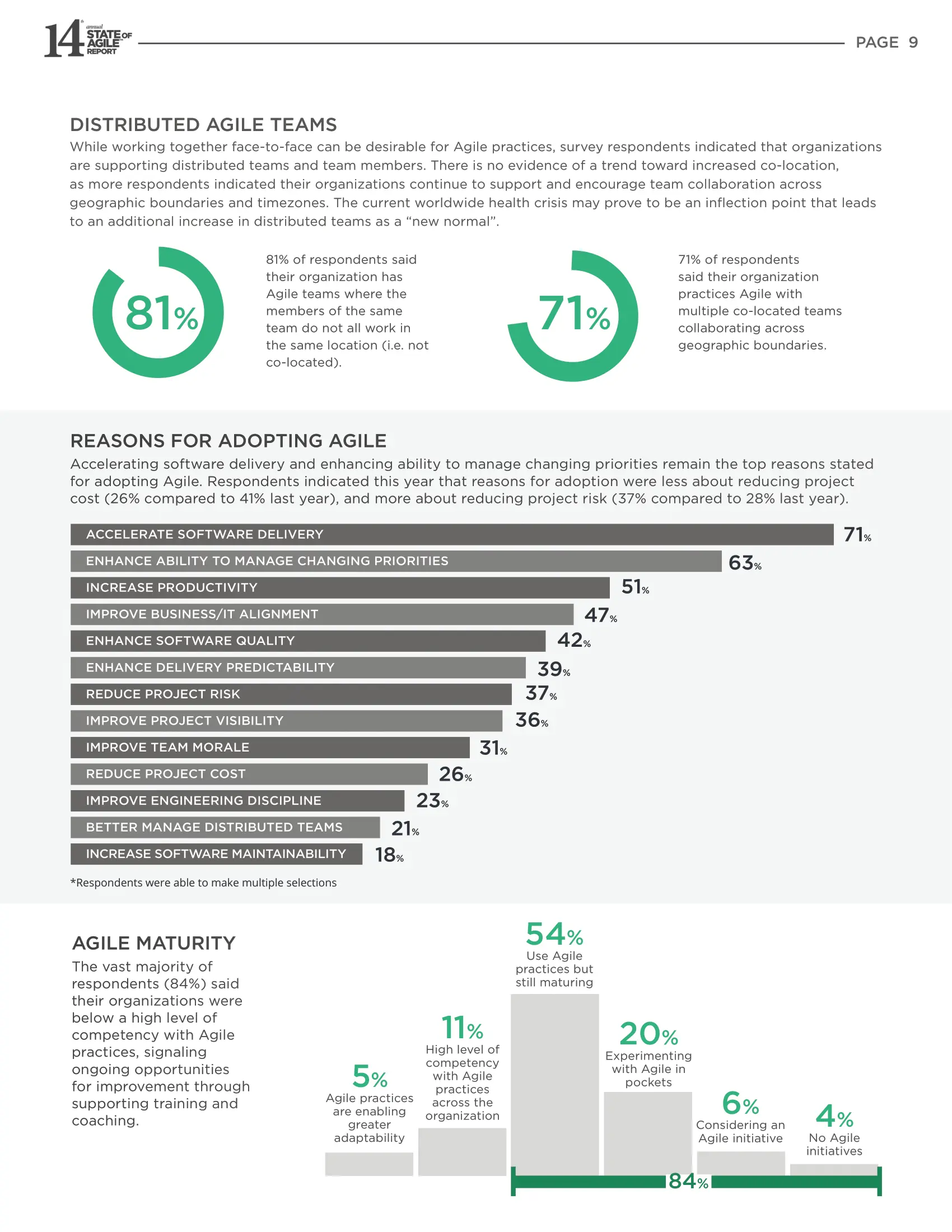 今年26%的受访者采用敏捷的重要原因是 降低项目成本。这比第13份年度报告中的41%有所下降,但接近第12份年度报告中24%的答复。