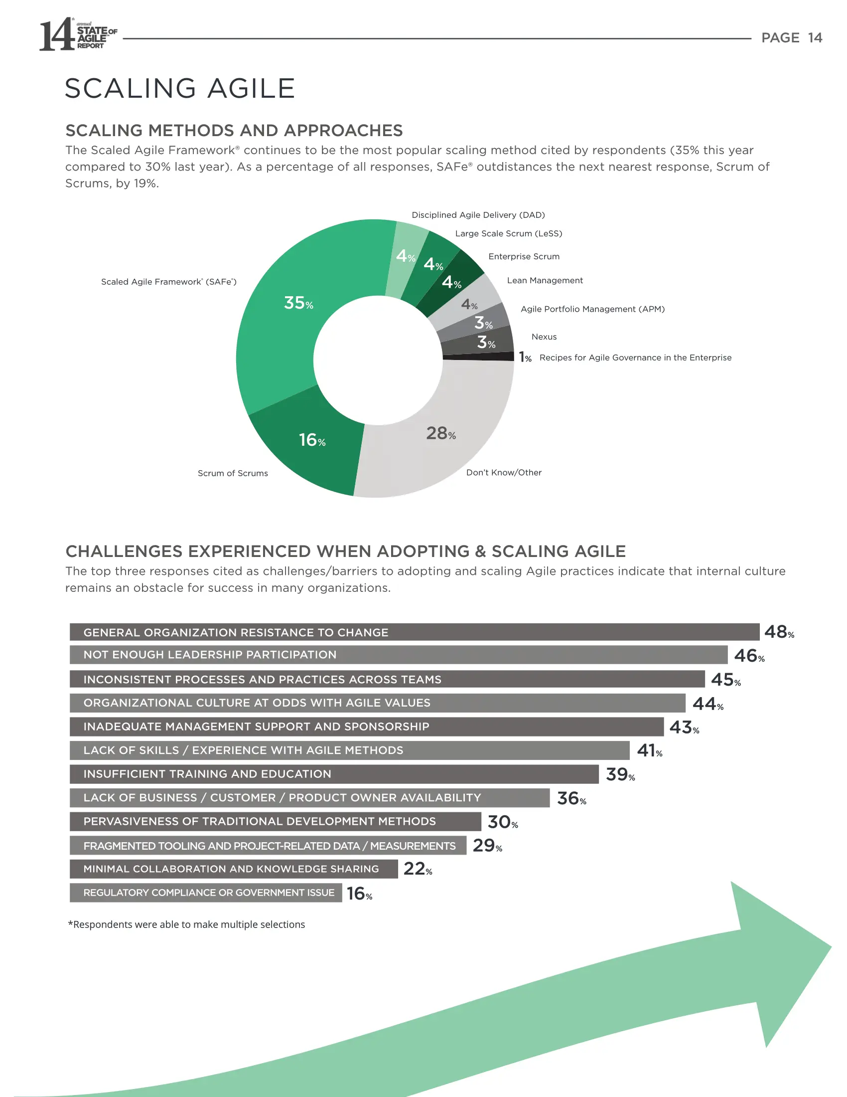 Scrum 是实践最广泛的敏捷框架,至少有75%的受访者在实践 Scrum 或包括 Scrum 的混合体。 SAFe®仍然是首选的规模化敏捷框架,在35%的受访者中处于领先地位,比去年上升了5%。
