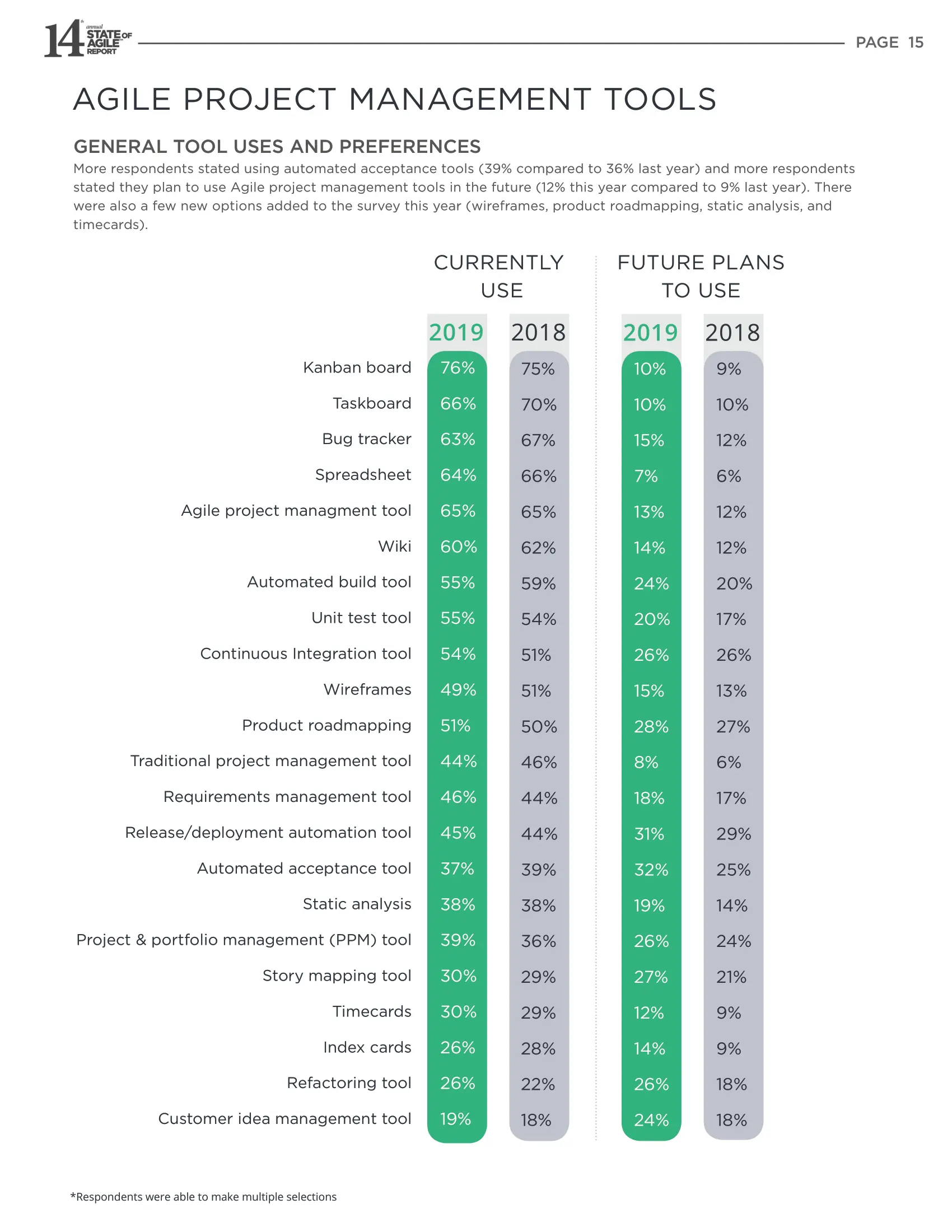 越来越多的受访者表示使用自动验收工具(39%,去年为36%),更多的受访者表示他们计划将来使用敏捷项目管理工具(今年为12%,去年为9%)。 今年的调查还增加了一些新选项(线框工具,产品路线图工具,静态分析和时间表)。
