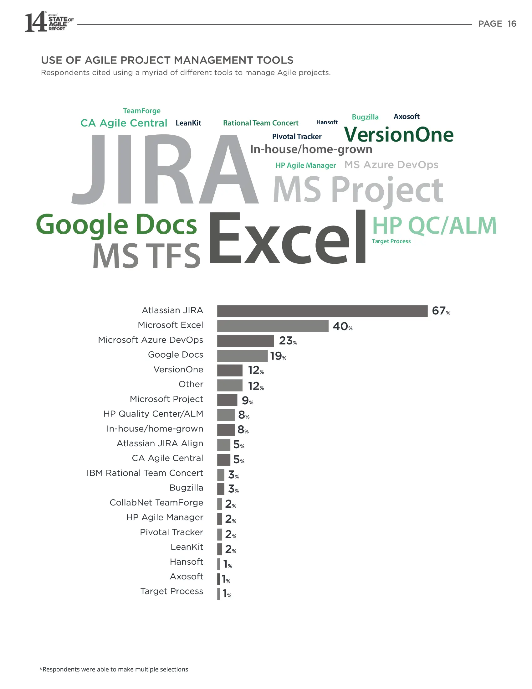 受访者引用了使用多种不同工具来管理敏捷项目的信息。从结果中我们可以看出,第一位是 JIRA,第二位是Excel。
