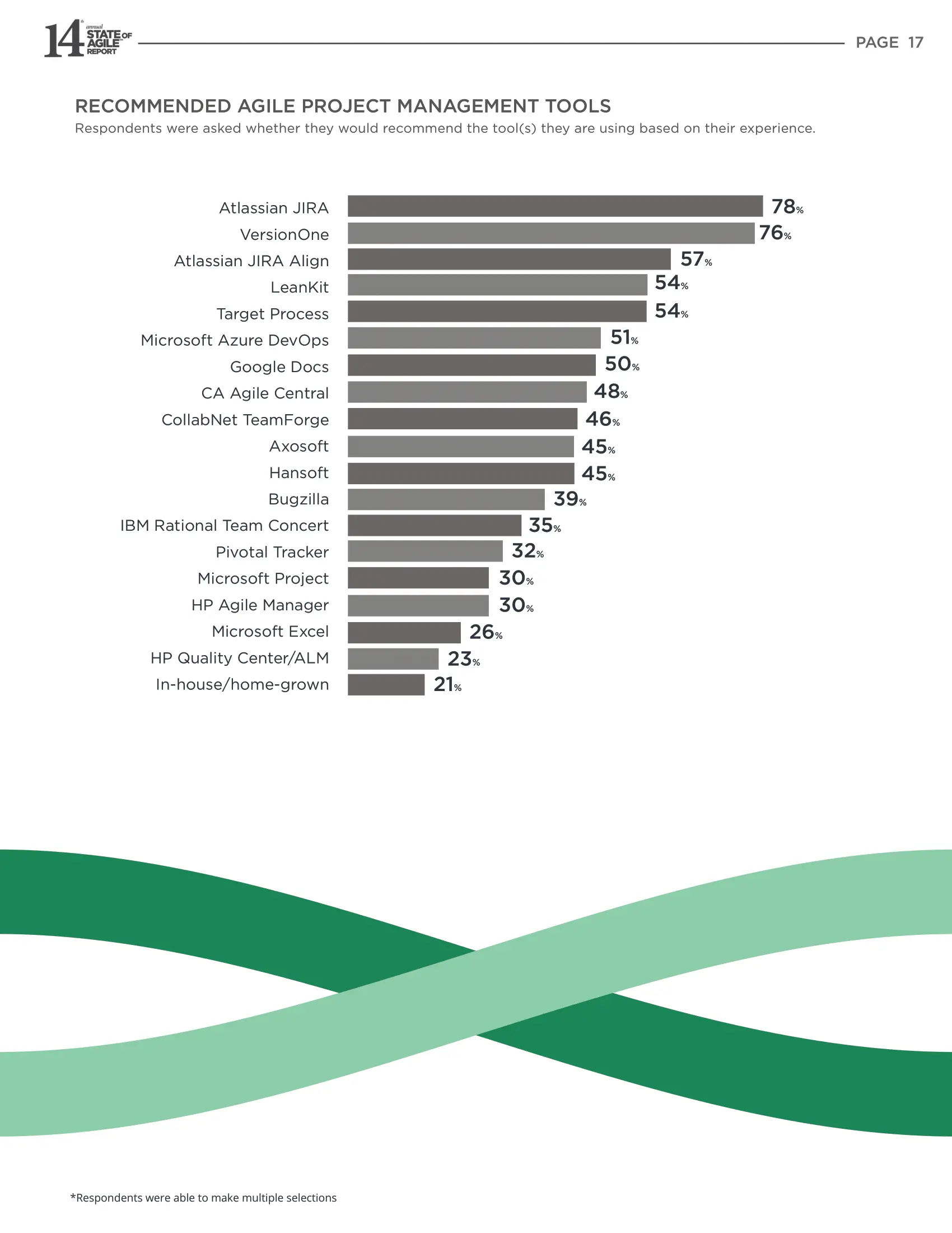 受访者中,推荐 Jira的人最多,其次是 VersionOne (这个有历史原因,这个调查最早就是VersionOne这个公司发起的,哈哈哈哈)