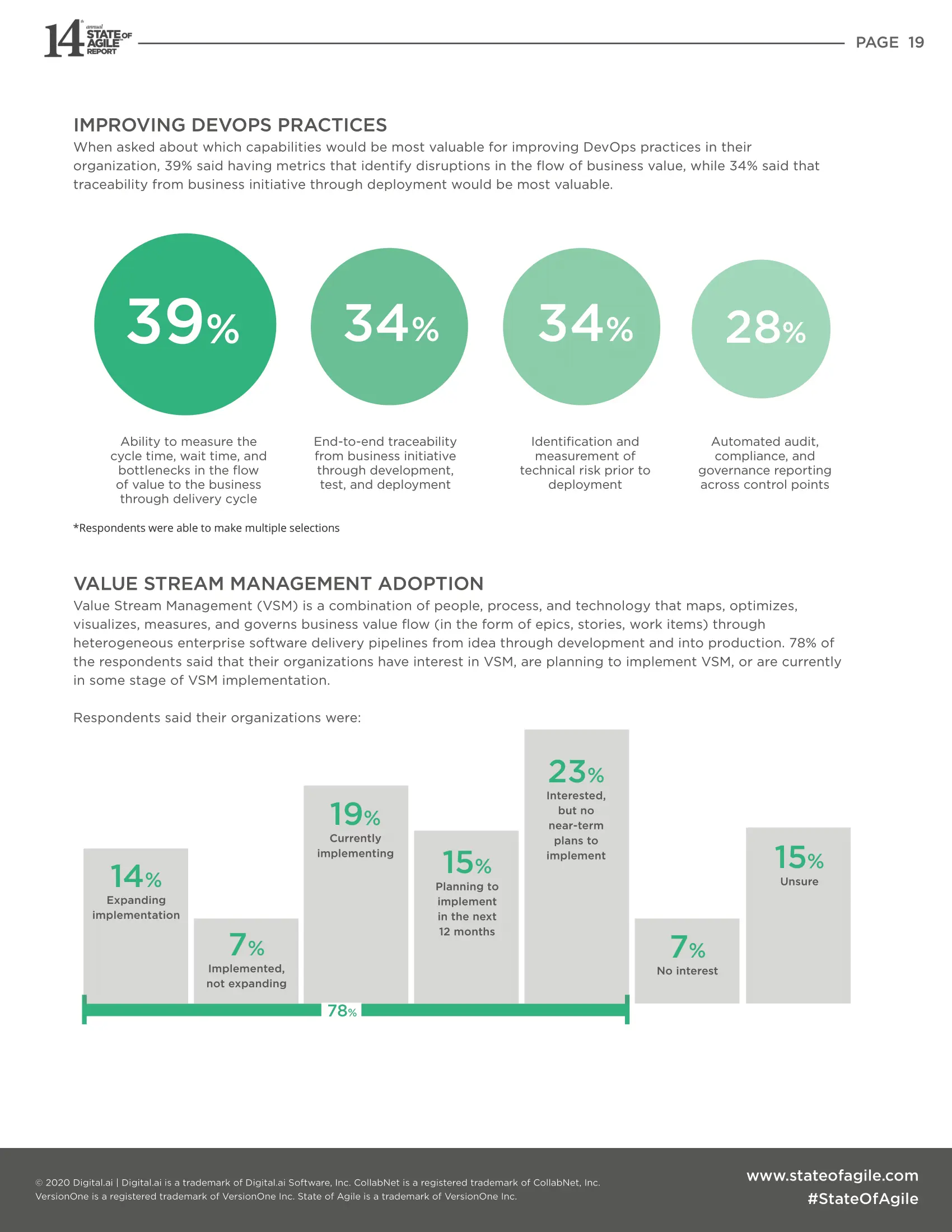 问及哪些能力对改善组织中的DevOps最有价值时,有39%的人说拥有确定的业务价值流中断的指标,而34%的人说从业务计划到部署的可追溯性将是最有价值的。