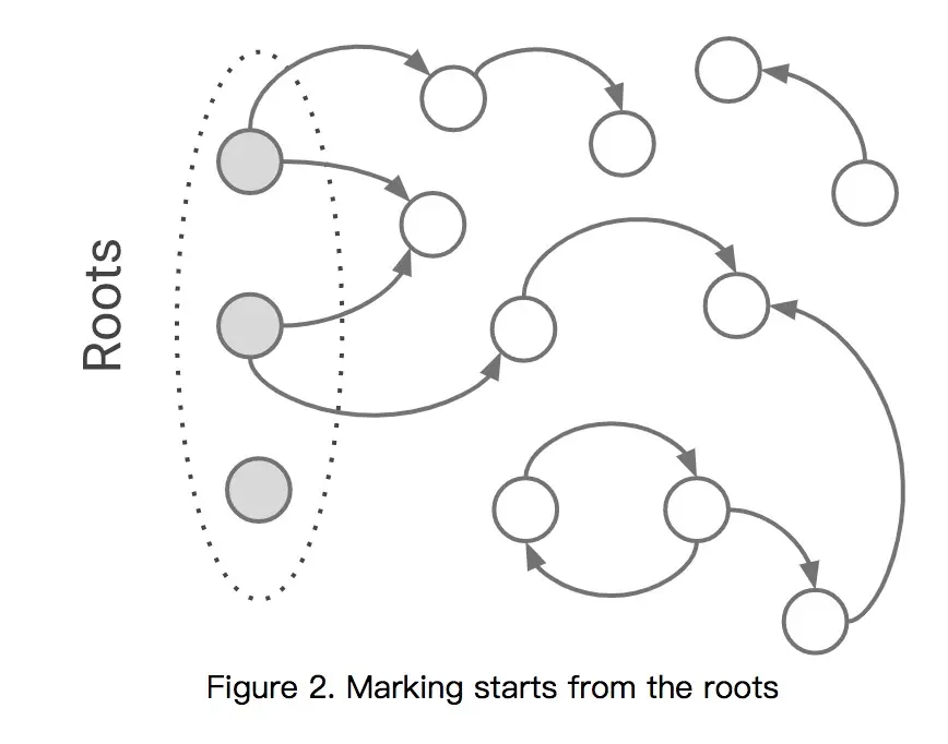 首先是标记过程阶段。标记阶段就是从一组根元素开始,递归遍历这组根元素,在这个遍历过程中,能到达的元素称为活动对象,没有到达的元素就可以判断为垃圾数据。