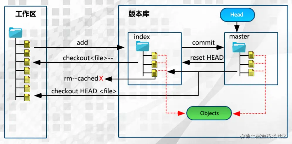 - 工作区:电脑上的目录;版本库(Repository):比如工作区中的.git隐藏目录,不属于工作区,是版本库。