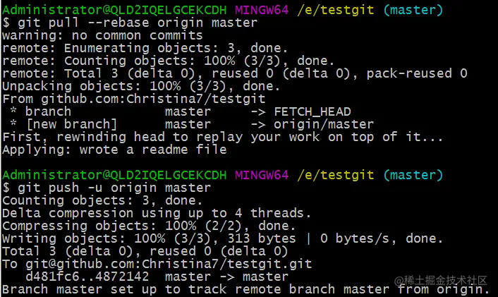 - 注意一定是新建的repository,里面原来没有文件,才能push成功