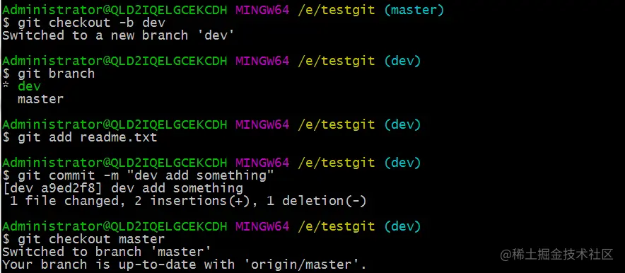 相当于git branch dev创建dev分支和git checkout dev切换到dev分支