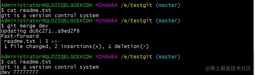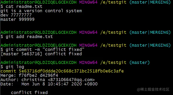 修改readme.txt成跟主干一致的,再用git log 查看分支合并情况