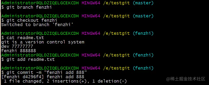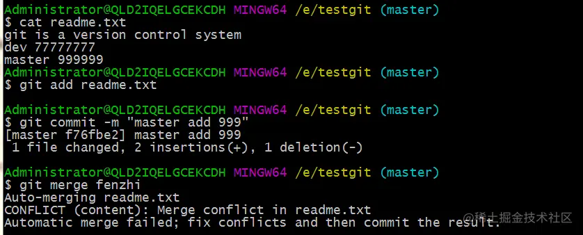 在fenzhi上的readme.txt添加了888,在master上的readme.txt添加了999,版本产生了冲突,无法在master上自动合并fenzhi