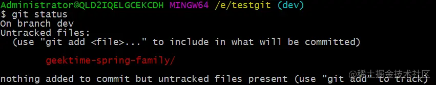 上图表明:1. add的文件并没有修改过,无法提交变更 2. geektime-spring-family/没有add,commit时无法识别,git没有把提交的文件加载进来,报红色的是需要提交的文件。