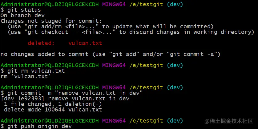 最后和远程仓库的分支同步 git push origin dev另一种情况是误删了,可以从版本库中恢复git checkout -- vulcan.txt